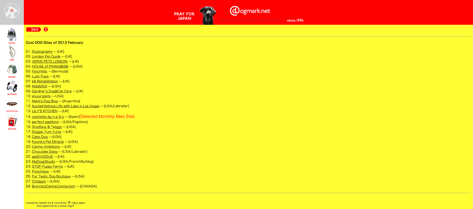 nuestra web www.caninetto.es ha sido elegida como la web sobre perros mas cool en el mes de febrero 2013 por el portal www.dogmark.net creado por Takashi Ito en Tokyo, Japon