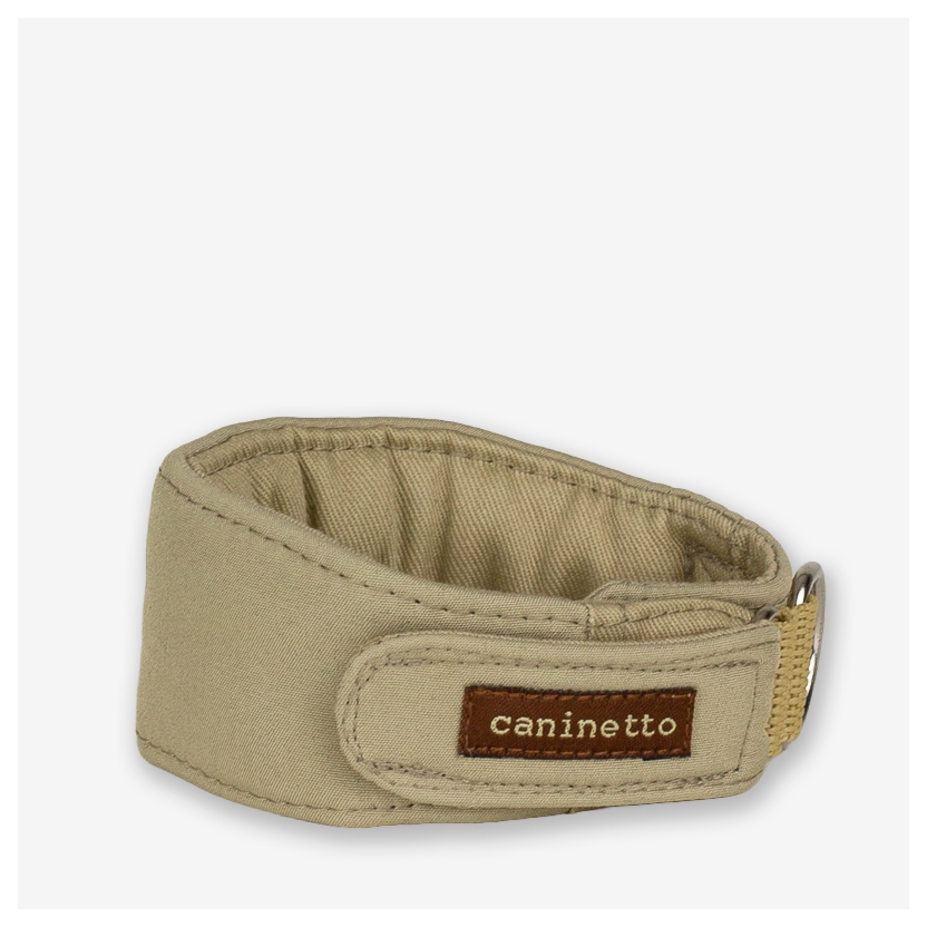 Collar acolchado para galgos en soft shell beige, ligero y cómodo. Interior de gabardina y cierre de velcro para un ajuste suave y seguro.