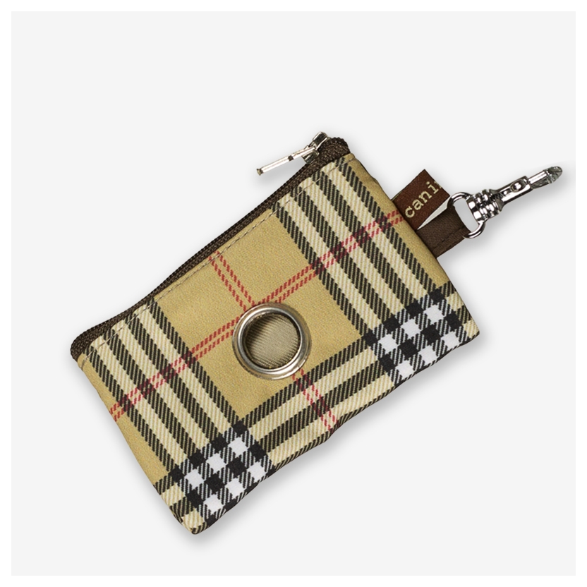 Porta-bolsas higiénicas para perros hecho de tejido tejano resistente. Con dispensador frontal y mosquetón para enganchar a la correa o mochila. Compatible con la mayoría de rollos estándar.
